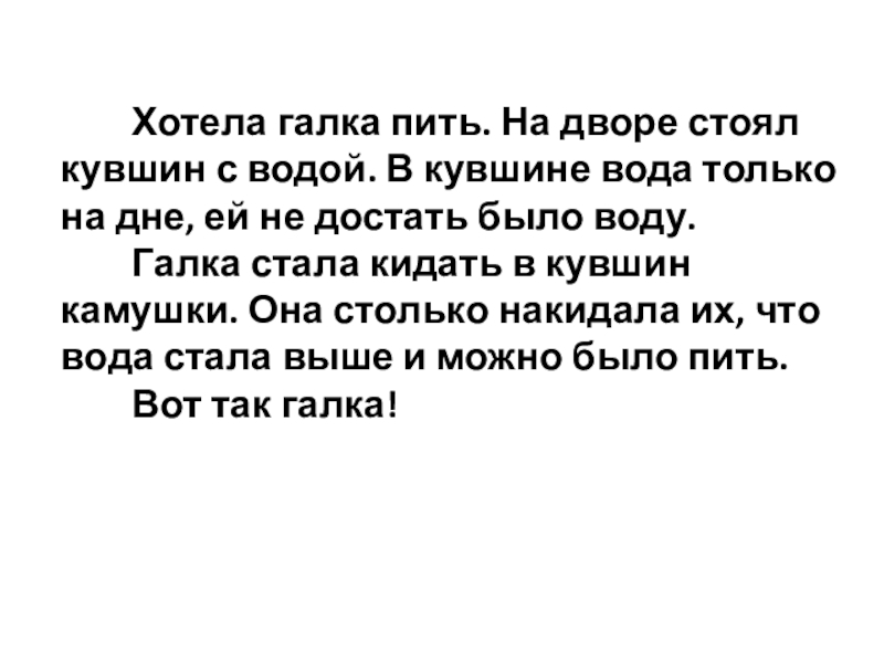 Галка стала кидать в кувшин камушки. Она столько накидала их, что вода стала выше и можно было пить.