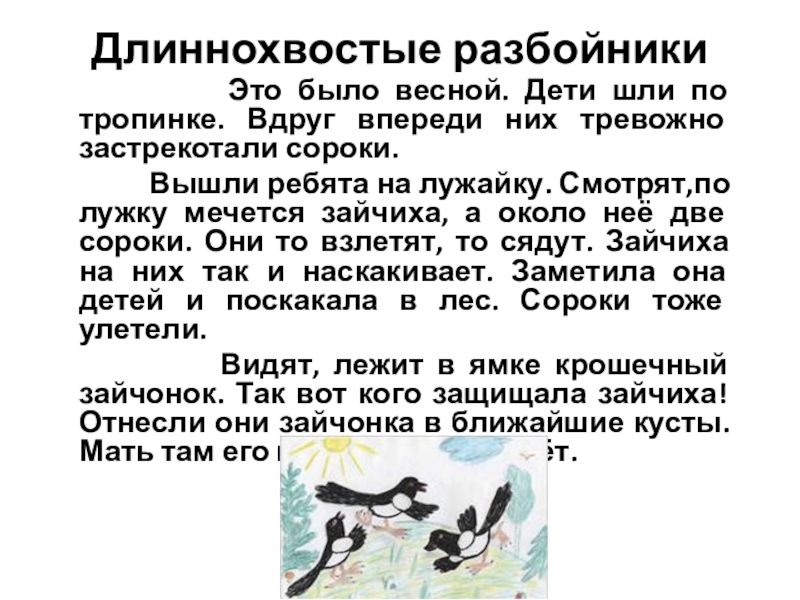 Вышли ребята на лужайку. Смотрят,по лужку мечется зайчиха, а около неё две сороки. Они то взлетят, то сядут. Зайчиха на них так и наскакивает. Заметила она детей и поскакала в лес. Сороки тоже улетели.