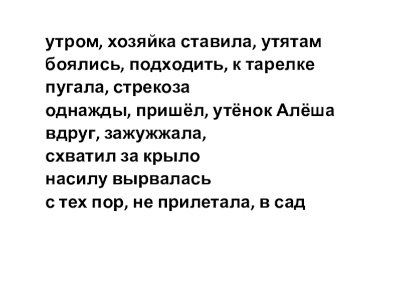 Однажды во двор пришёл утёнок Алёша. Вдруг зажужжала стрекоза. Алёша схватил Её за крыло. Насилу она вырвалась.