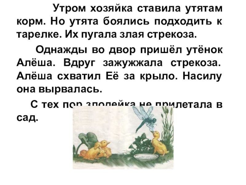 Утром хозяйка ставила утятам корм. Но утята боялись подходить к тарелке. Их пугала злая стрекоза.
