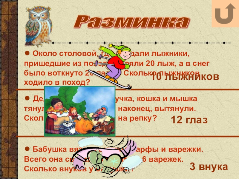 ● Дед, баба, внучка, Жучка, кошка и мышка тянули-тянули репку и, наконец, вытянули. Сколько глаз смотрело на репку?