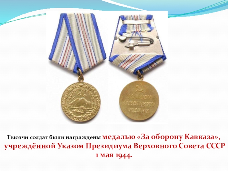 Слайд 14Тысячи солдат были награждены медалью «За оборону Кавказа», учреждённой Указом Президиума