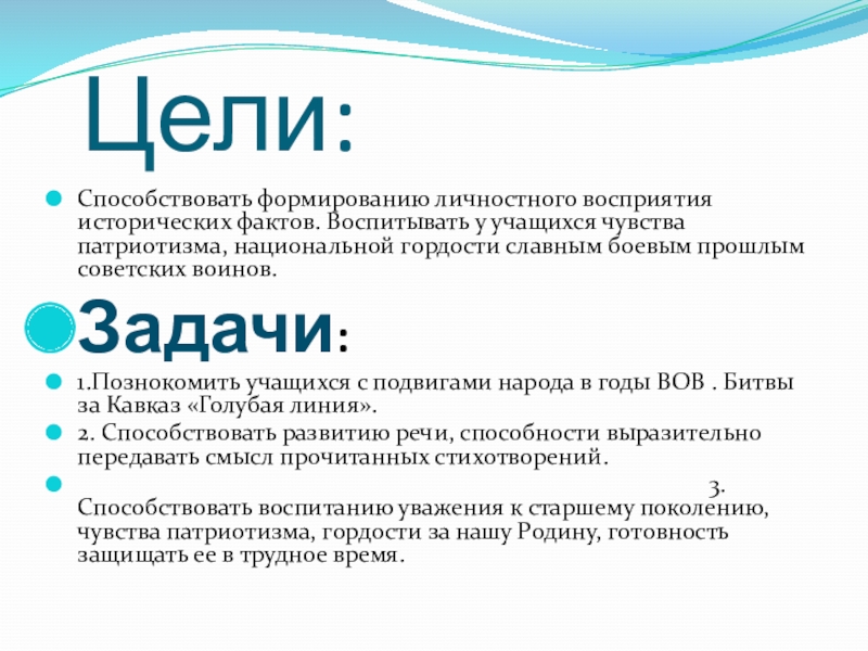 Цели:Способствовать формированию личностного восприятия исторических фактов. Воспитывать у учащихся чувства патриотизма, национальной гордости славным боевым прошлым советских воинов.Задачи: 1.Познокомить учащихся с подвигами народа в годы ВОВ . Битвы за Кавказ «Голубая линия».2. Способствовать развитию
