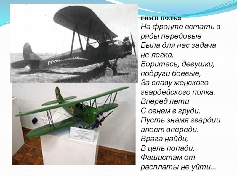 гимн полкаНа фронте встать в ряды передовые  Была для нас задача не легка.  Боритесь, девушки, подруги боевые,