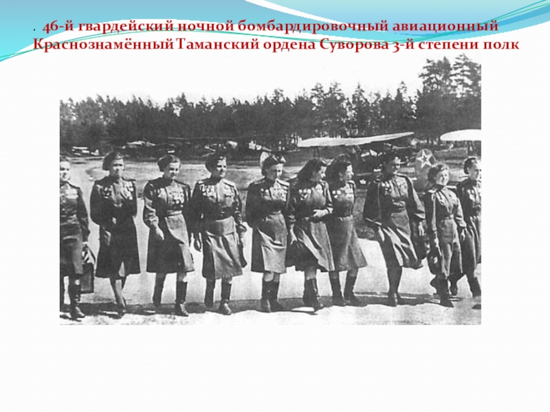 Слайд 9.  46-й гвардейский ночной бомбардировочный авиационный Краснознамённый Таманский ордена Суворова 3-й