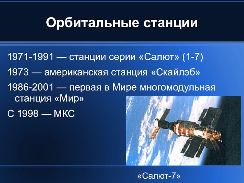Орбитальные станции1971-1991 — станции серии «Салют» (1-7)1973 — американская станция «Скайлэб»1986-2001 — первая в Мире многомодульная станция