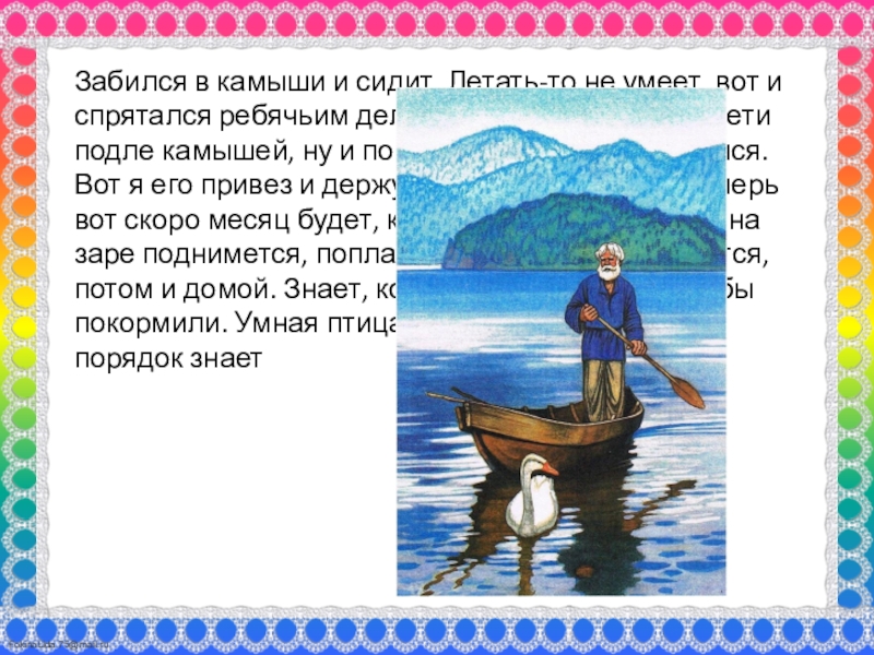 Слайд 15Забился в камыши и сидит. Летать-то не умеет, вот и спрятался