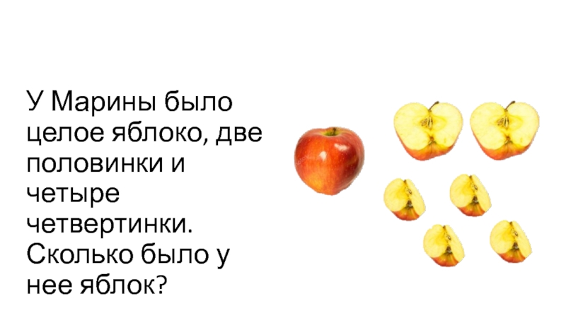 Слайд 11У Марины было целое яблоко, две половинки и четыре четвертинки. Сколько