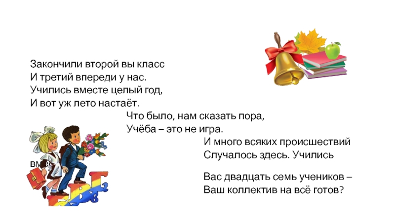 Закончили второй вы класс И третий впереди у нас. Учились вместе целый год, И вот уж лето настаёт.