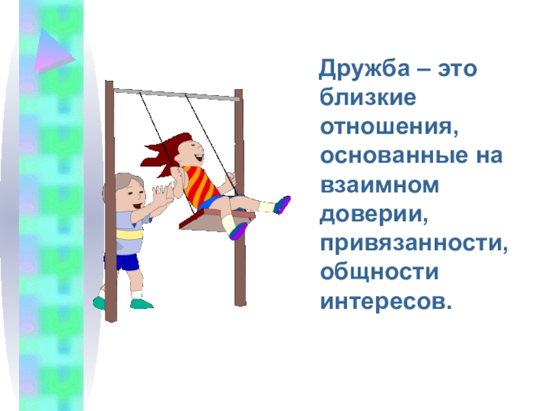 Слайд 5 Дружба – это близкие отношения, основанные на взаимном доверии,