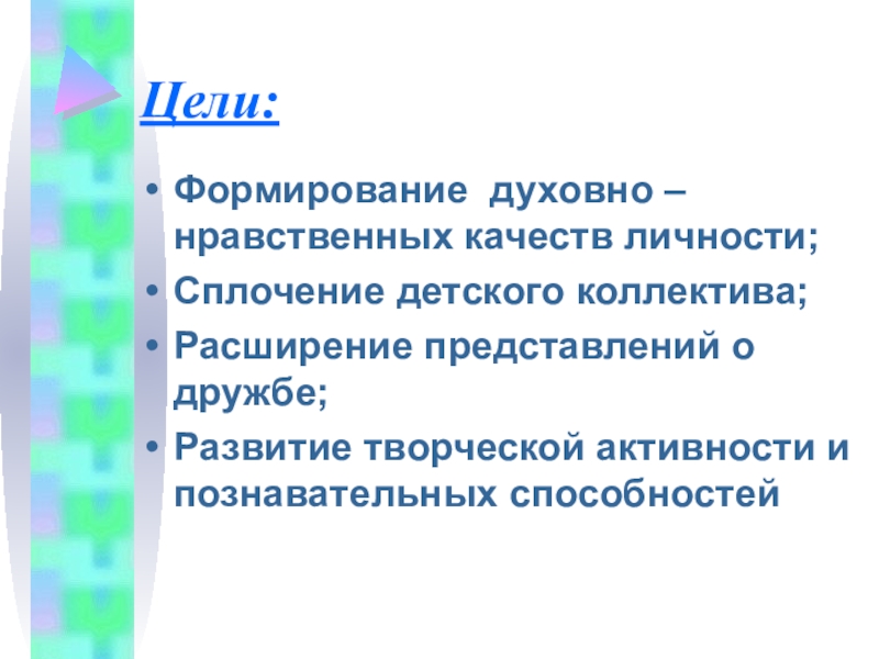 Цели:Формирование духовно – нравственных качеств личности;Сплочение детского коллектива;Расширение представлений о дружбе;Развитие творческой активности и познавательных способностей