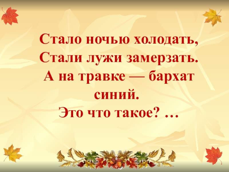 Стало ночью холодать,Стали лужи замерзать.А на травке — бархат синий.Это что такое? …