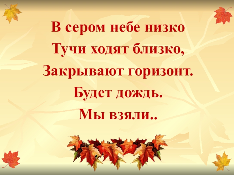 В сером небе низкоТучи ходят близко,Закрывают горизонт.Будет дождь.Мы взяли..