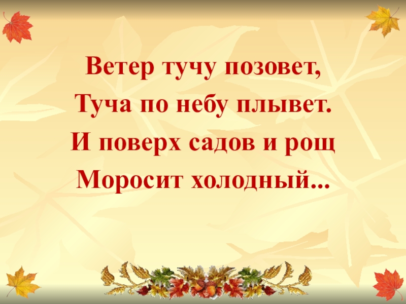 Ветер тучу позовет,Туча по небу плывет.И поверх садов и рощМоросит холодный...