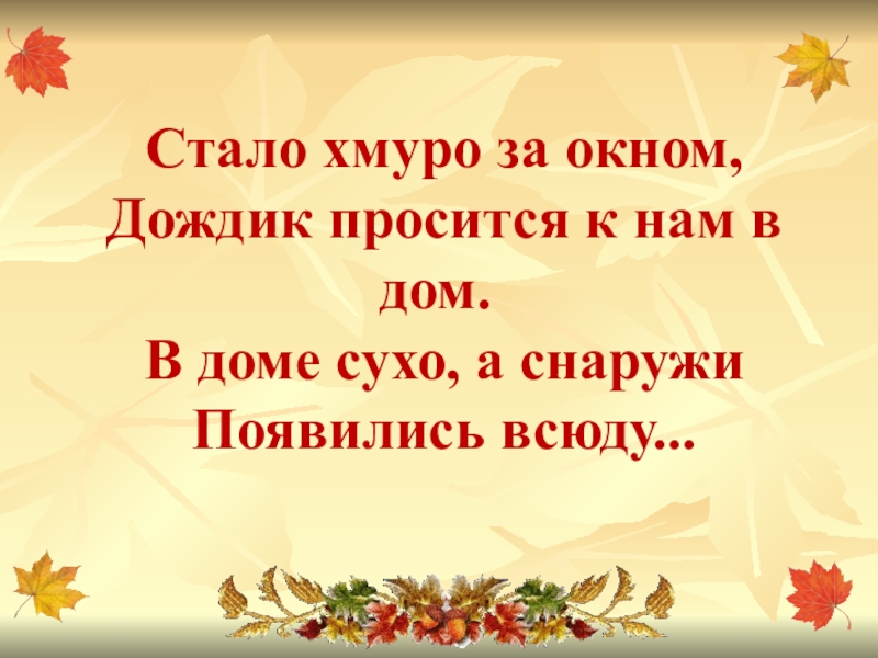 Стало хмуро за окном,Дождик просится к нам в дом.В доме сухо, а снаружиПоявились всюду...