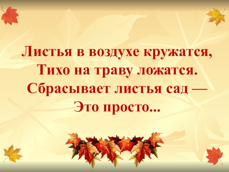 Листья в воздухе кружатся,Тихо на траву ложатся.Сбрасывает листья сад —Это просто...