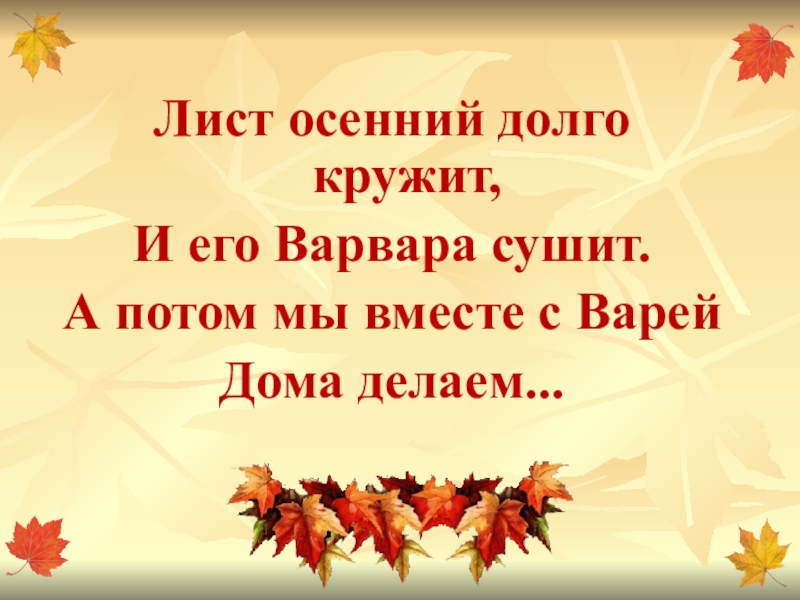 Лист осенний долго кружит,И его Варвара сушит.А потом мы вместе с ВарейДома делаем...