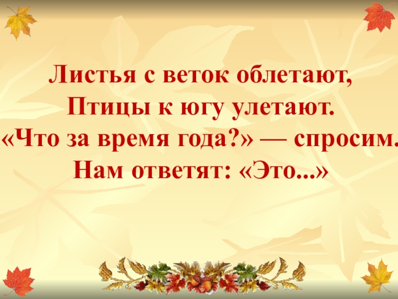 Листья с веток облетают,Птицы к югу улетают.«Что за время года?» — спросим.Нам ответят: «Это...»