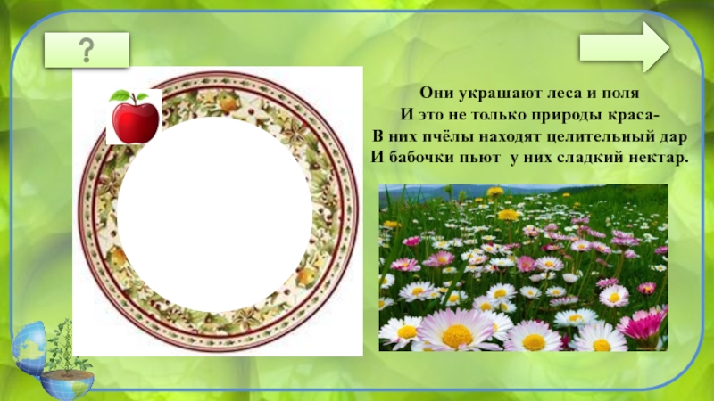 ЦВЕТЫОни украшают леса и поляИ это не только природы краса-В них пчёлы находят целительный дарИ бабочки пьют