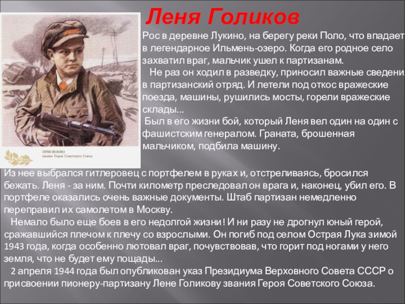 2 апреля 1944 года был опубликован указ Президиума Верховного Совета СССР о присвоении пионеру-партизану Лене Голикову звания Героя Советского Союза.