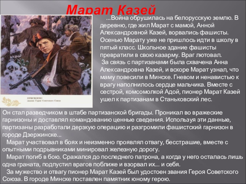 За мужество и отвагу пионер Марат Казей был удостоен звания Героя Советского Союза. В городе Минске поставлен памятник юному герою.