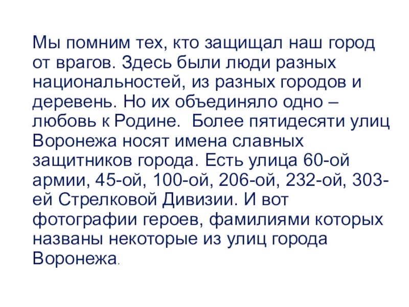 люди разных национальностей, из разных городов и деревень. Но их объединяло одно – любовь к Родине. Более пятидесяти улиц Воронежа носят имена славных защитников города. Есть улица 60-ой армии, 45-ой, 100-ой, 206-ой, 232-ой, 303-ей Стрелковой Дивизии. И вот фотографии героев, фамилиями которых названы некоторые из улиц города Воронежа.