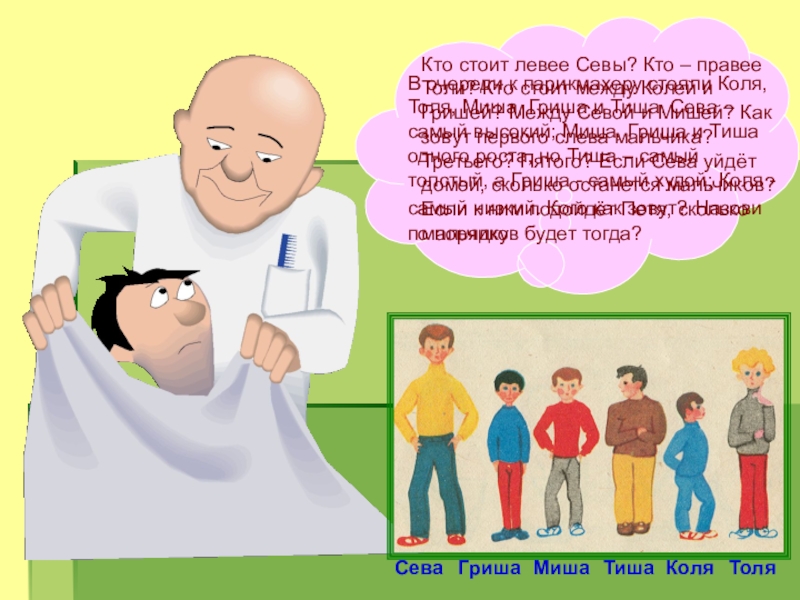 Кто стоит левее Севы? Кто – правее Толи? Кто стоит между Колей и Гришей? Между Севой и Мишей? Как зовут первого слева мальчика? Третьего? Пятого? Если Сева уйдёт домой, сколько останется мальчиков? Если к ним подойдёт Петя, сколько мальчиков будет тогда?