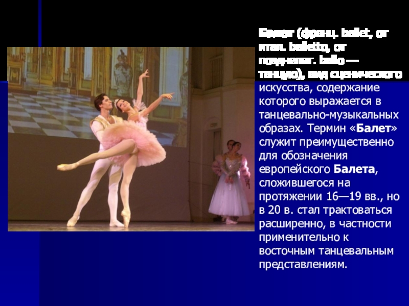 вид сценического искусства, содержание которого выражается в танцевально-музыкальных образах. Термин «Балет» служит преимущественно для обозначения европейского Балета, сложившегося на протяжении 16—19 вв., но в 20 в. стал трактоваться расширенно, в частности применительно к восточным танцевальным представлениям.