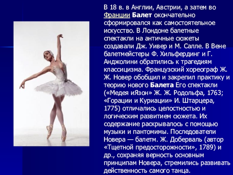 окончательно сформировался как самостоятельное искусство. В Лондоне балетные спектакли на античные сюжеты создавали Дж. Уивер и М. Салле. В Вене балетмейстеры Ф. Хильфердинг и Г. Анджолини обратились к трагедиям классицизма. Французский хореограф Ж. Ж. Новер обобщил и закрепил практику и теорию нового Балета Его спектакли («Медея иЯзон» Ж. Ж. Родольфа, 1763; «Горации и Куриации» И. Штарцера, 1775) отличались целостностью и логическим развитием сюжета. Их содержание раскрывалось с помощью музыки и пантомимы. Последователи Новера — балетм. Ж. Доберваль (автор «Тщетной предосторожности», 1789) и др., сохраняя верность основным принципам Новера, стремились развивать действенность самого танца.