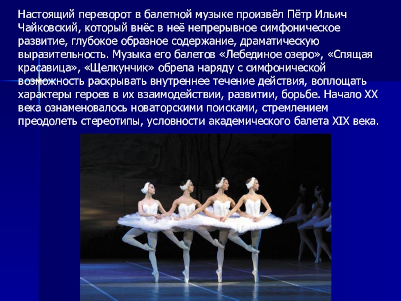 в неё непрерывное симфоническое развитие, глубокое образное содержание, драматическую выразительность. Музыка его балетов «Лебединое озеро», «Спящая красавица», «Щелкунчик» обрела наряду с симфонической возможность раскрывать внутреннее течение действия, воплощать характеры героев в их взаимодействии, развитии, борьбе. Начало XX века ознаменовалось новаторскими поисками, стремлением преодолеть стереотипы, условности академического балета XIX века.