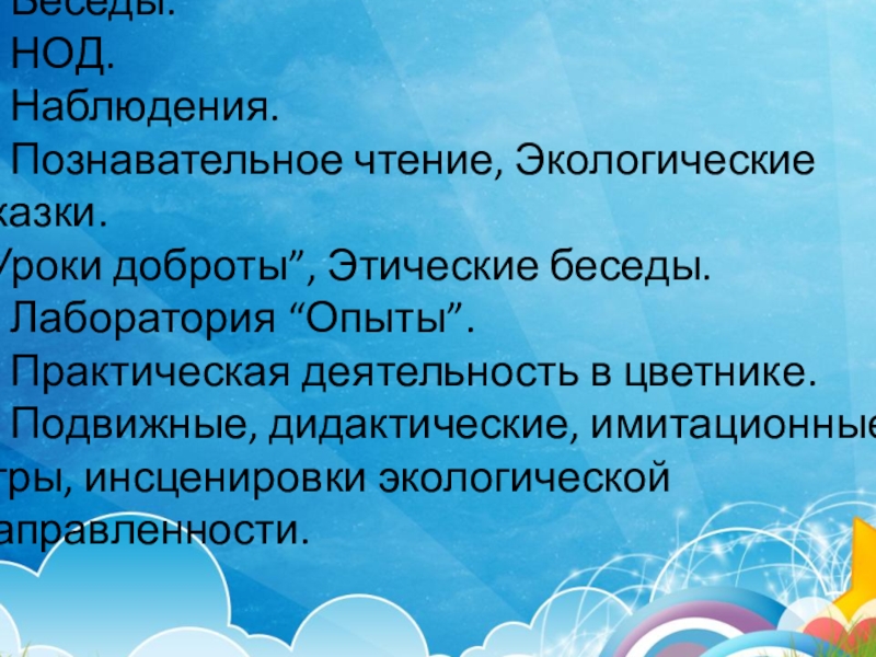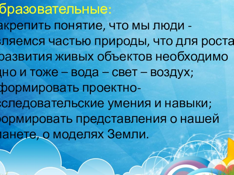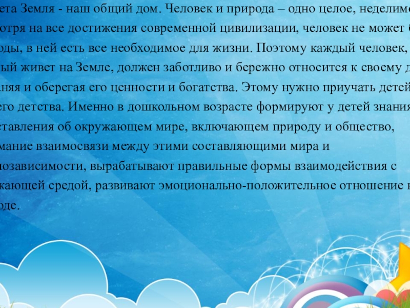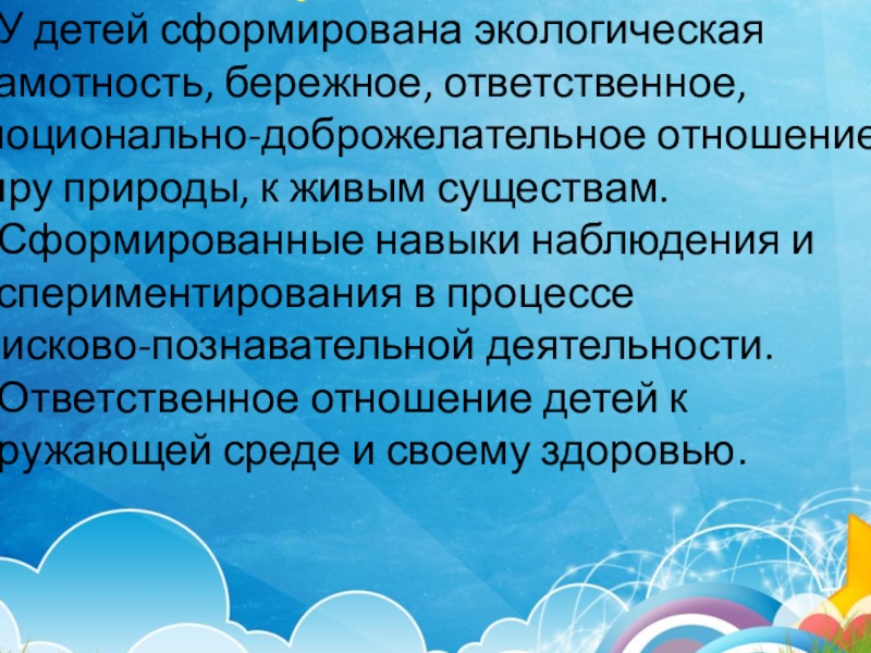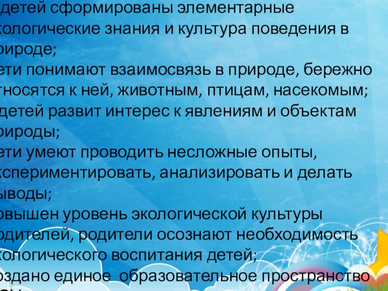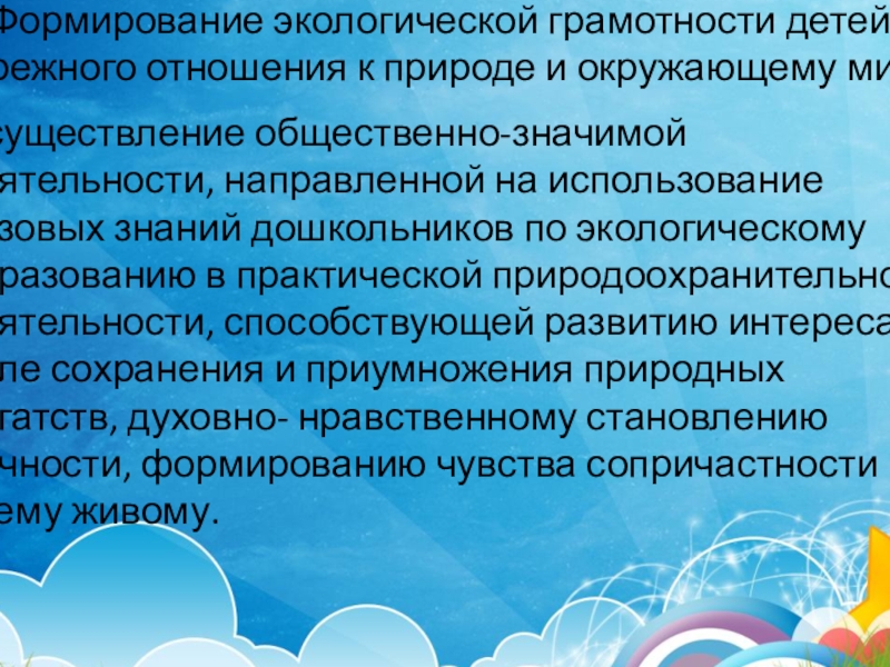 Осуществление общественно-значимой деятельности, направленной на использование базовых знаний дошкольников по экологическому образованию в практической природоохранительной деятельности, способствующей развитию интереса в деле сохранения и приумножения природных богатств, духовно- нравственному становлению личности, формированию чувства сопричастности ко всему живому.
