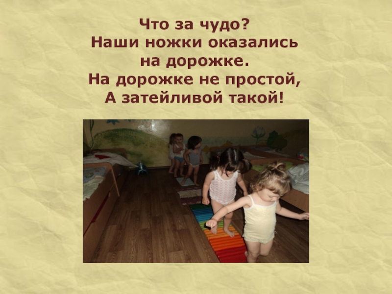Что за чудо?Наши ножки оказались на дорожке.На дорожке не простой,А затейливой такой!
