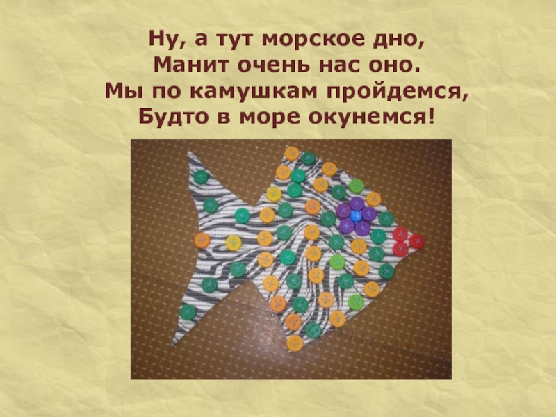 Ну, а тут морское дно,Манит очень нас оно.Мы по камушкам пройдемся,Будто в море окунемся!