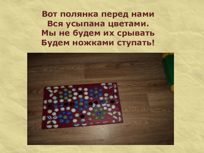 Вот полянка перед намиВся усыпана цветами.Мы не будем их срыватьБудем ножками ступать!