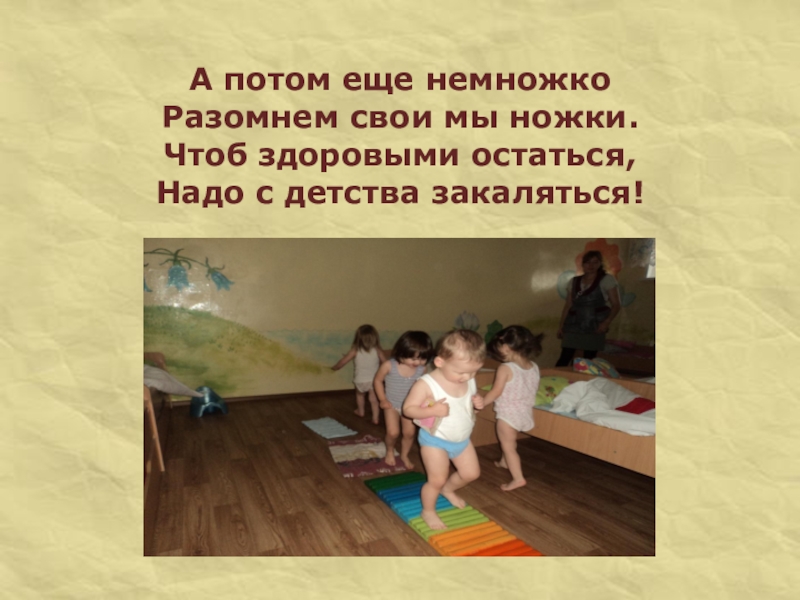 А потом еще немножкоРазомнем свои мы ножки.Чтоб здоровыми остаться,Надо с детства закаляться!