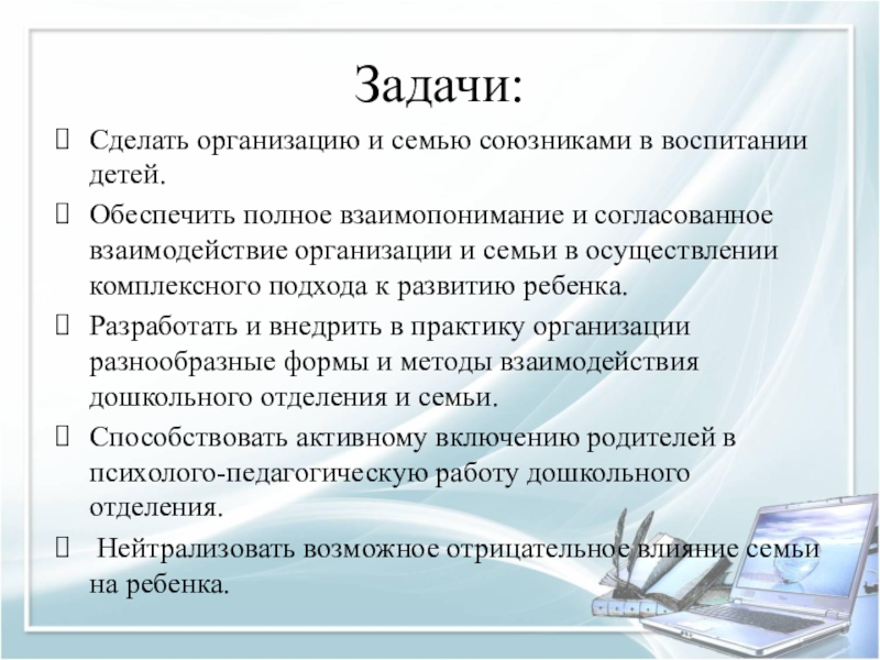 Способствовать активному включению родителей в психолого-педагогическую работу дошкольного отделения.