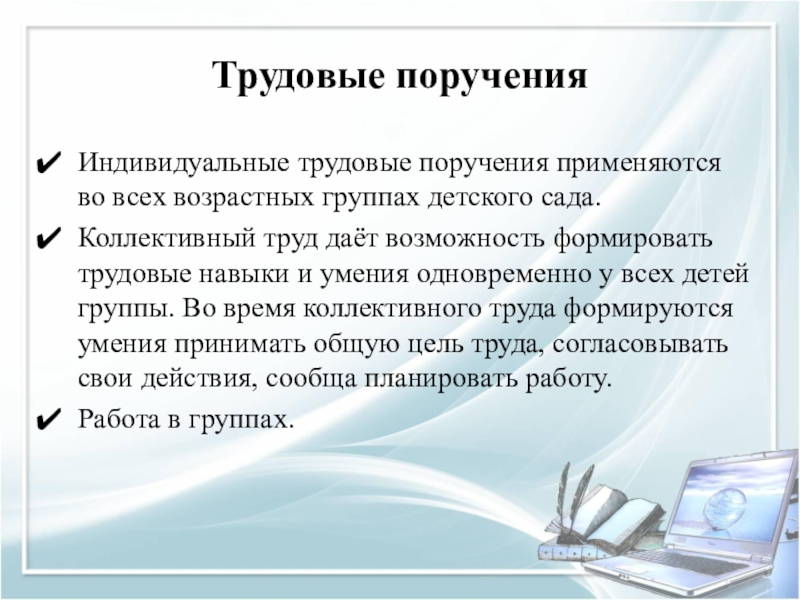 труд даёт возможность формировать трудовые навыки и умения одновременно у всех детей группы. Во время коллективного труда формируются умения принимать общую цель труда, согласовывать свои действия, сообща планировать работу.