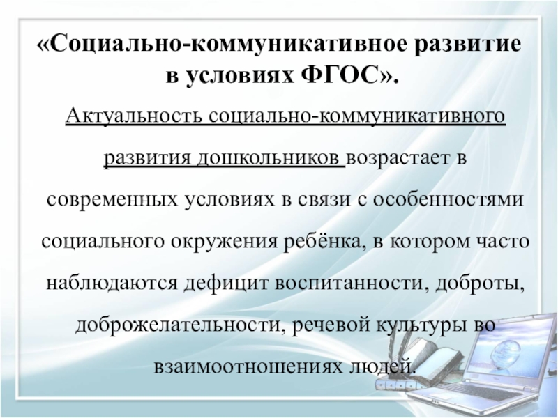 современных условиях в связи с особенностями социального окружения ребёнка, в котором часто наблюдаются дефицит воспитанности, доброты, доброжелательности, речевой культуры во взаимоотношениях людей.