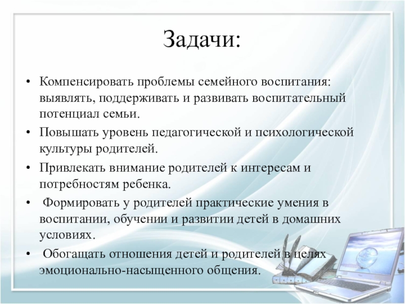 Компенсировать проблемы семейного воспитания: выявлять, поддерживать и развивать воспитательный потенциал семьи.