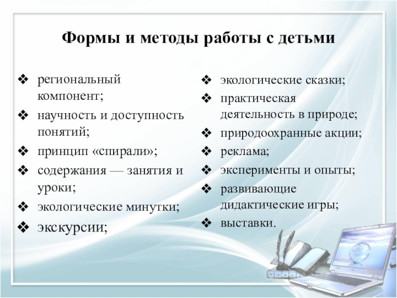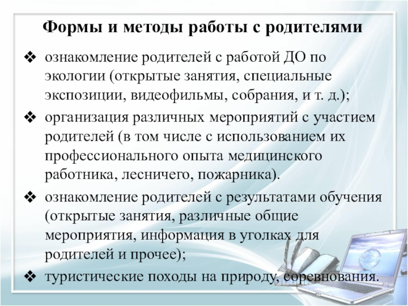 экологии (открытые занятия, специальные экспозиции, видеофильмы, собрания, и т. д.);