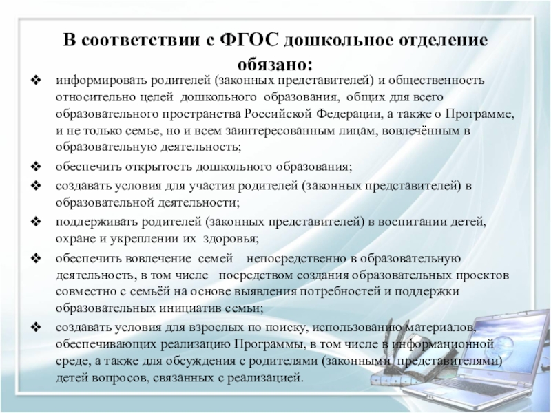 Слайд 52В соответствии с ФГОС дошкольное отделение обязано: