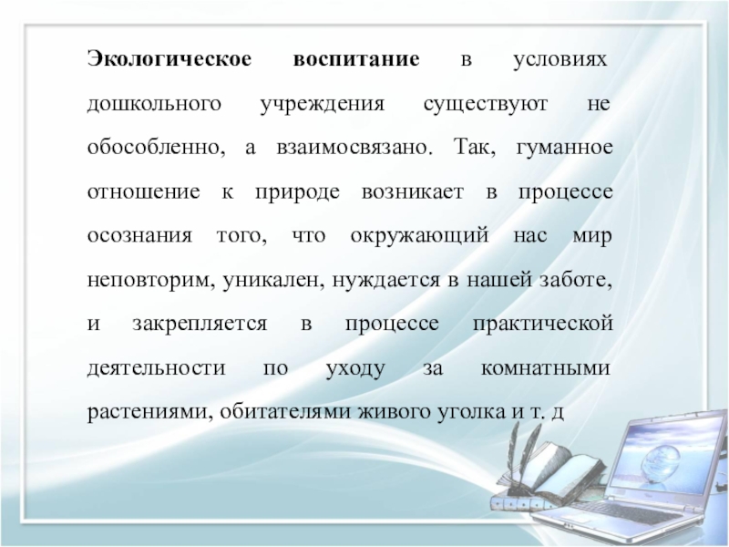 Так, гуманное отношение к природе возникает в процессе осознания того, что окружающий нас мир неповторим, уникален, нуждается в нашей заботе, и закрепляется в процессе практической деятельности по уходу за комнатными растениями, обитателями живого уголка и т. д