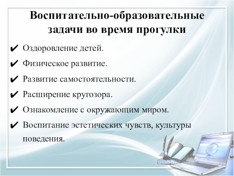 Слайд 42Воспитательно-образовательные задачи во время прогулки