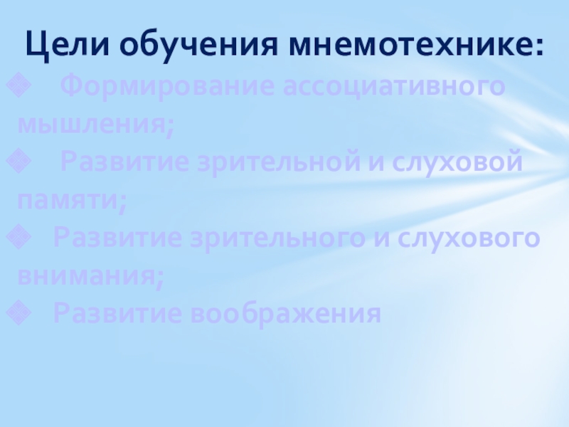 Цели обучения мнемотехнике:Формирование ассоциативного мышления;Развитие зрительной и слуховой памяти;Развитие зрительного и слухового внимания;Развитие воображения