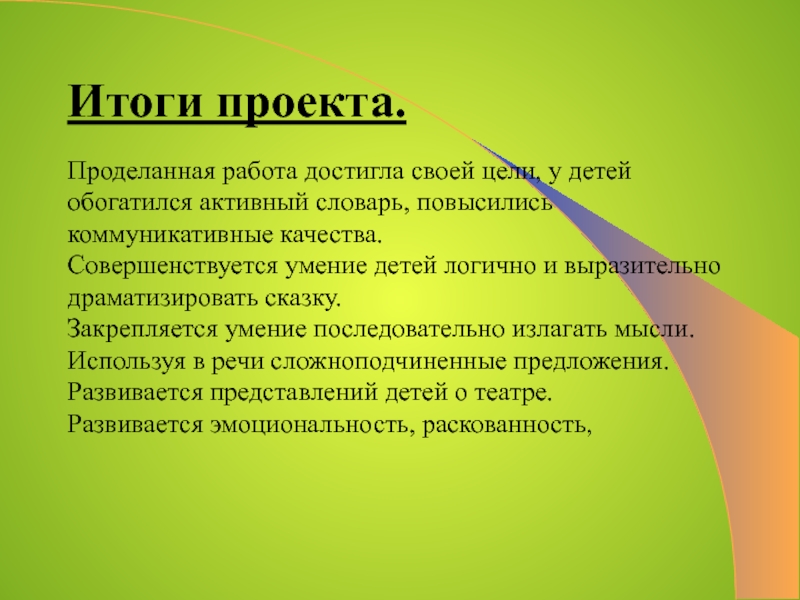 Совершенствуется умение детей логично и выразительно драматизировать сказку.
