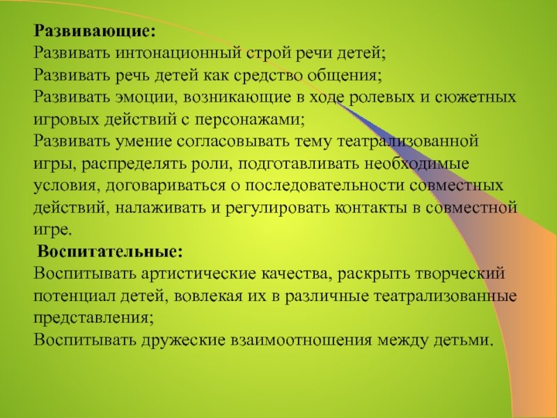 Развивать умение согласовывать тему театрализованной игры, распределять роли, подготавливать необходимые условия, договариваться о последовательности совместных действий, налаживать и регулировать контакты в совместной игре.