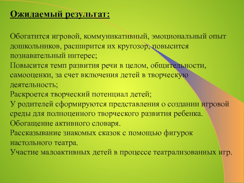 Повысится темп развития речи в целом, общительности, самооценки, за счет включения детей в творческую деятельность;