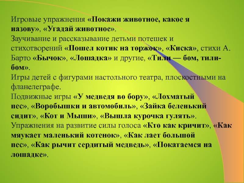 Упражнения на развитие силы голоса «Кто как кричит», «Как мяукает маленький котенок», «Как лает большой пес», «Как рычит сердитый медведь», «Покатаемся на лошадке».