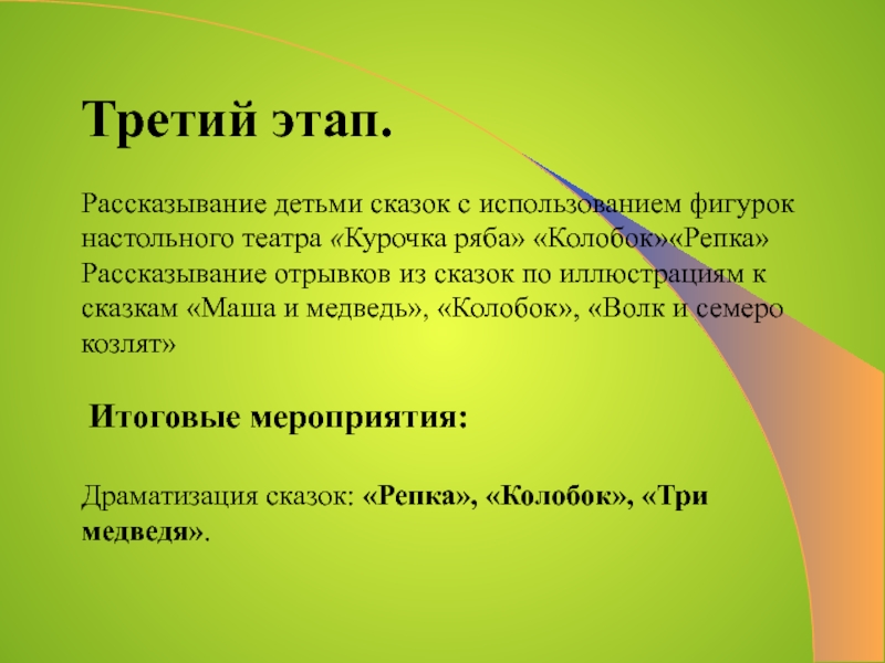 Рассказывание детьми сказок с использованием фигурок настольного театра «Курочка ряба» «Колобок»«Репка»