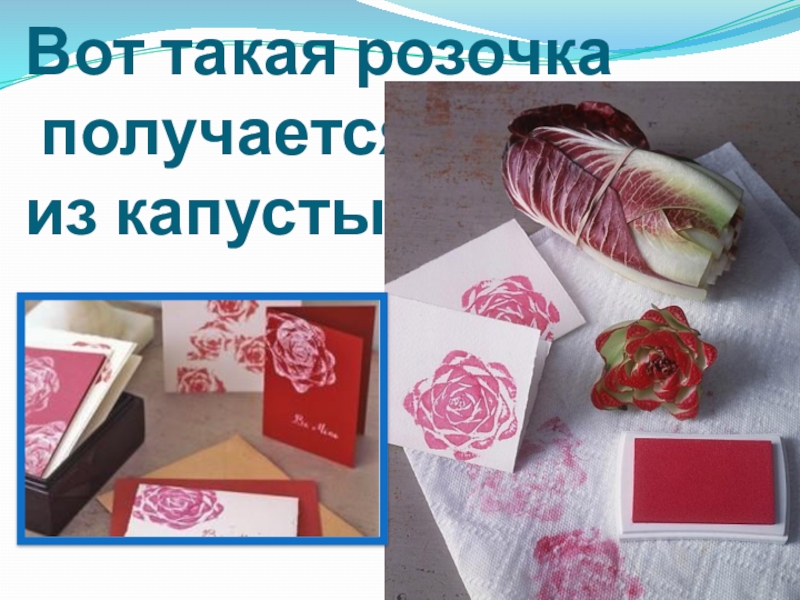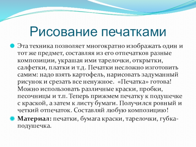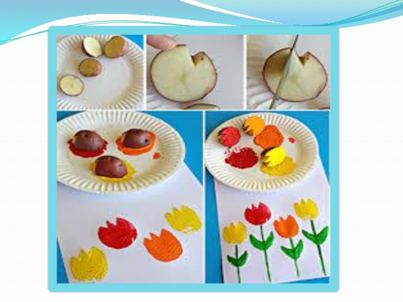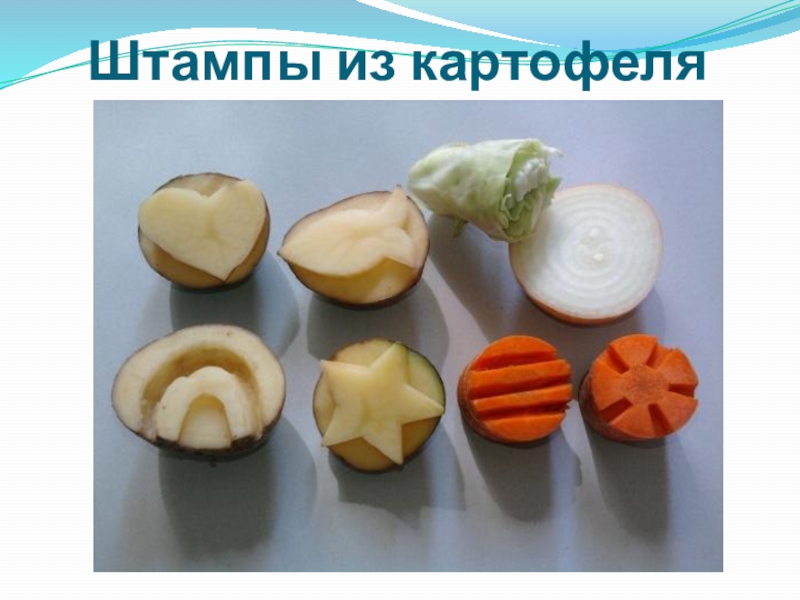 составляя из его отпечатков разные композиции, украшая ими тарелочки, открытки, салфетки, платки и т.д. Печатки несложно изготовить самим: надо взять картофель, нарисовать задуманный рисунок и срезать все ненужное. «Печатка» готова! Можно использовать различные краски, пробки, песочницы и т.п. Теперь прижмем печатку к подушечке с краской, а затем к листу бумаги. Получился ровный и четкий отпечаток. Составляй любую композицию!